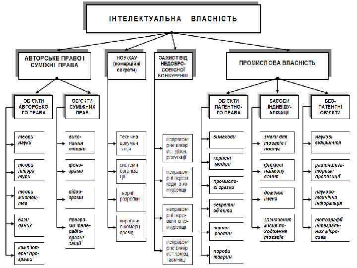 Об’єкти права інтелектуальної власності Об’єкти промислової власності Нетрадиційні об’єкти інтелектуальної власності Винаходи Сорти рослин Корисні моделі Породи тварин Промислові зразки Ст. 420 ЦКУ Об’єкти авторського права і суміжних прав Літературні твори Художні твори Комп’ютерні програми Топографії інтегральних мікросхем Торговельні марки (знак для товарів і послуг) Бази даних Комерційні таємниці Виконання творів Географічні зазначення Наукові відкриття Фонограми та відеограми Фірмові найменування Раціоналізаторські пропозиції Передачі організацій мовлення Не визначаються об’єктами авторського права офіційні символи і знаки (прапори, герби, ордени і медалі, грошові знаки тощо). Авторське право не поширюється на будь-яку ідею, процедуру, метод, процес, конкуренцію, відкриття, винахід, корисну модель, промисловий зразок, торговельну марку, раціоналізаторську пропозицію, звичайні дані, навіть якщо вони виражені, описані, пояснені, проілюстровані тощо.