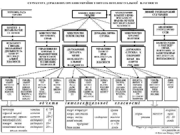 Основні нормативні акти які регулюють відносини у сфері інтелектуальної власності Міжнародні договори до яких приєдналась Україна Конституція України; Кодекси України: цивільний та господарський; Закон України «Про авторське право і суміжні права» ; Закон України «Про видавничу справу» ; Закон України «Про державну підтримку засобів масової інформації та соціальний захист журналістів» ; Закон України «Про друковані засоби масової інформації (пресу) в Україні» ; Закон України «Про електронний цифровий підпис» ; Закон України «Про захист від недобросовісної конкуренції» ; Закон України «Про захист інформації в інформаційно-телекомунікаційних системах» ; Закон України «Про інформаційні агентства» ; Закон України «Про інформацію» ; Закон України «Про кінематографію» ; Закон України «Про науково-технічну інформацію» ; Закон України «Про наукову і науково-технічну експертизу» ; Закон України «Про охорону прав на винаходи і корисні моделі» ; Закон України «Про охорону прав на зазначення походження товарів» ; Закон України «Про охорону прав на знаки для товарів і послуг» ; Закон України «Про охорону прав на промислові зразки» ; Закон України «Про охорону прав на сорти рослин» ; Закон України «Про охорону прав на топографії інтегральних мікросхем» ; Закон України «Про професійних творчих працівників та творчі спілки» ; Закон України «Про рекламу» ; Закон України «Про розповсюдження примірників аудіовізуальних творів, фонограм, відеограм, комп'ютерних програм, баз даних» ; Закон України «Про систему суспільного телебачення і радіомовлення України» ; Закон України «Про телебачення і радіомовлення» . Бернська конвенція (Паризький акт 1971 р. ); Римська конвенція 1961 р. ; Женевська конвенція 1974 р. ; Догові ВОІВ про авторське право; Паризька конвенція, Стокгольмський акт; Договір про патентну кооперацію 1970 р. ; Договір про патентне право 2000 р. ; Мадридська угода 1891 р. ; Мадридський протокол 1989 р. ; Договір про закони щодо товарних знаків 1994 р. ; Міжнародна конвенція про охорону нових сортів рослин.