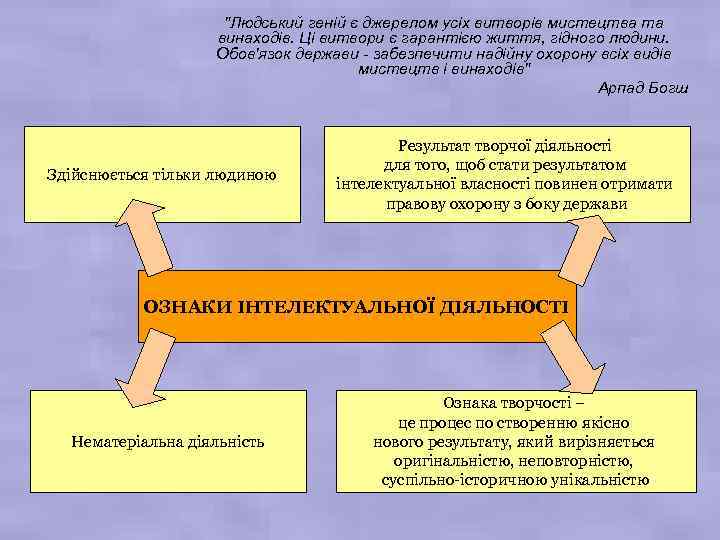 "Людський геній є джерелом усіх витворів мистецтва та винаходів. Ці витвори є гарантією життя, гідного людини. Обов'язок держави - забезпечити надійну охорону всіх видів мистецтв і винаходів" Арпад Богш Здійснюється тільки людиною Результат творчої діяльності для того, щоб стати результатом інтелектуальної власності повинен отримати правову охорону з боку держави ОЗНАКИ ІНТЕЛЕКТУАЛЬНОЇ ДІЯЛЬНОСТІ Нематеріальна діяльність Ознака творчості – це процес по створенню якісно нового результату, який вирізняється оригінальністю, неповторністю, суспільно-історичною унікальністю
