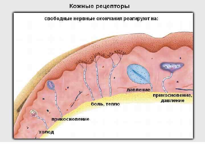 Свободные нервные окончания n Связанные с болевыми ощущениями (ноцицепторы). Им же, как наиболее многочисленной группе рецепторов, приписывается опосредование температурных и тактильных раздражений.