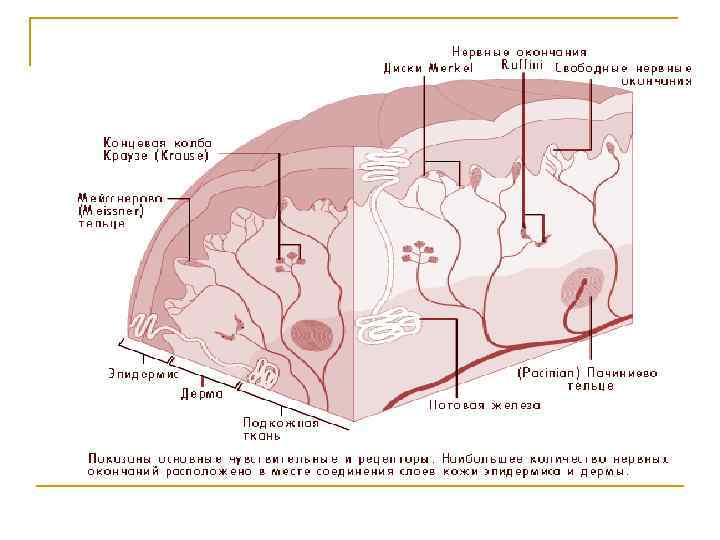 Диски Меркеля и тельца Руффини n Более глубоко залегающие рецепторы, реагирующие на давление. К числу полимодальных механорецепторов относят и колбы Краузе, которые предположительно имеют отношение и к отражению температурных изменений.