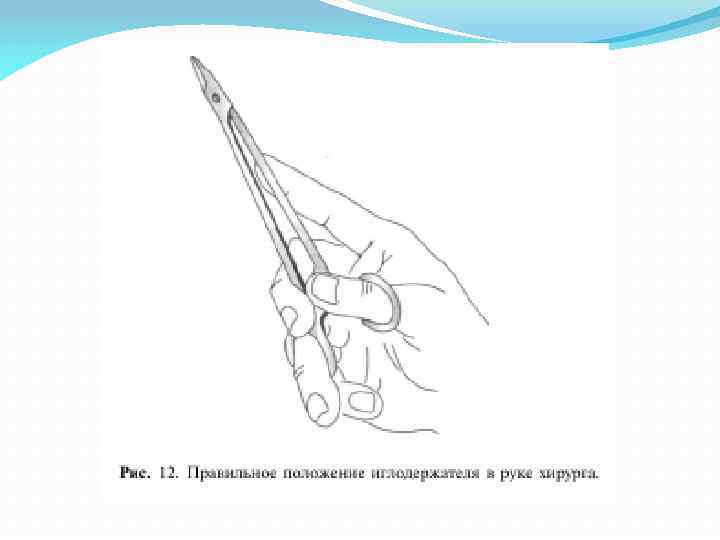 Правильное положение стандартного иглодер жателя в руке хирурга должно быть следующим: в кольца иглодержателя вводят соответственно дистальные фаланги I и IV пальцев; место вблизи оси перекрещивающихся рукоя ток фиксируют кончиком II пальца.