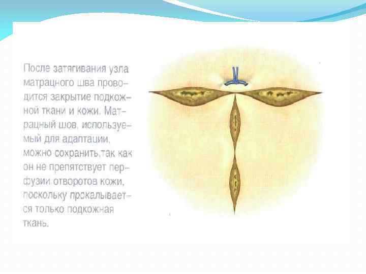 Шов Альговера Кроме того, для повышения эстетических свойств вертикаль ного П образного шва концы нити проводят через дерму и подкожную жировую клетчатку без выкола на поверхность кожи с одной стороны — шов Альговера