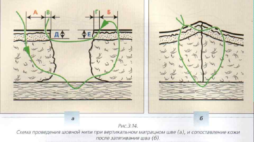 Вертикальный матрацный (сопоставляющий) шов Мак. Милана-Донати (Mac. Millen-Donati) - применяется в тех случаях, когда края раны чрезмерно подняты, мобилизованы или имеют неодинаковую и в то же время значительную толщину. Вкол делают на расстоянии (1 - 2 см), и, пройдя на уровне самой глубокой точки раны, выкол производится с другой стороны в симметричной точке. Затем накладывают поверхностную часть стежка с проведением иглы на минимальном от края раны расстоянии. Недостатки : • возможность образования грубых поперечных полос -> применяется ограниченно.