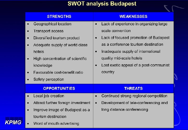 Project background l l KPMG`s Client: Tourism Division of the Ministry of Economic Affairs Project scope: determine the Ec. Impact of the new 5000 -people Budapest Convention Center to be developed at Millennium City Center, Budapest Project period: April-June 2000 (3 months project) A project`s master plan was not ready at the time the study was performed by KPMG Travel, Leisure & Tourism Group CEE