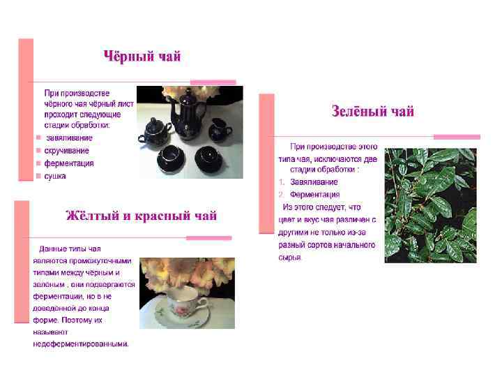 Всё многообразие чаёв делят на четыре основных типа: Желтый Зеленый Красный Черный Современное оформление чая