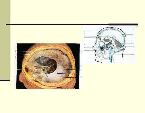 n Большинство костей основания черепа и лицевого черепа имеют неправильную форму. n Кости свода черепа относятся по форме к плоским костям и состоят из наружной и внутренней компактных пластинок, между которыми располагается губчатый слой – диплоэ. Внутренняя компактная пластинка тонкая, бедна органическими веществами и называется стеклянной, т. к. может ломаться при травмах головы. Кости свода черепа снаружи покрыты надкостницей (pericranium), а к их внутренней поверхности непосредственно прилежит твердая оболочка (pachymeniux или dura mater) головного мозга. Надкостница рыхло соединяется с костями свода и срастается с ними только по ходу швов. Твердая мозговая оболочка также слабо связана с костями свода. Этим обусловлена возможность развития поднадкостничных (субперикраниальных) и эпидуральных (надтвердооболочечных) гематом при травмах головы, причем для поднадкостничных гематом характерно распространение от шва до шва.