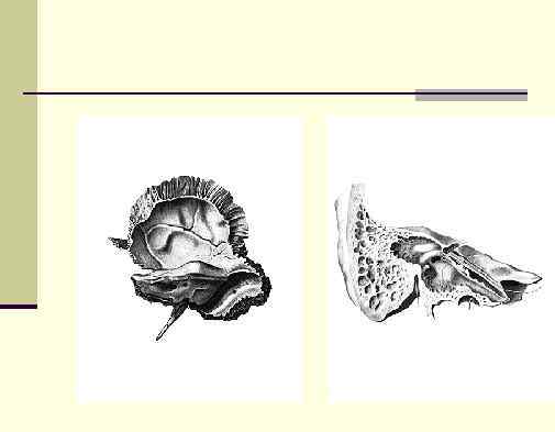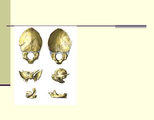 n Череп новорожденного -кузьмин n Мозг и орган чувств развивается быстрее, чем n n жевательный аппарат. Едва заметны Гайморова пазуха, большие глазницы, крупные лобные бугры, две лобные кости, роднички. Б. крыл. не срослись с телом. Щели между частями височной кости. Сосцевидный отросток не выражен, как и остальные бугры и линии черепа. Слуховая часть неполное кольцо, наружный слуховой проход отсутствует. Недоразвитие челюстей.