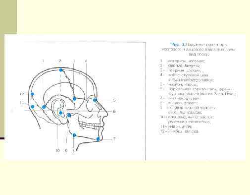 Краниометрические точки: n Глабелла – наиболее выступающая точка в области n n n n надпереносья, где лобная кость образуют более или менее выраженную выпуклость Метопион – точка, лежащая на месте пересечения линии, соединяющей вершины лобных бугров с сагиттальной плоскостью Брегма – точка на месте схождения сагиттального и венечного швов Ламбда – точка на пересечении ламбдовидного и сагиттального швов Базион – точка на середине передного края большого затылочного отверстия Nазион – точка пересечения носо-лобного шва с сагиттальной плоскостью Инион – наружный затылочный выступ ………….