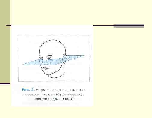 Профиль лица определяют величиной лицевого угла. n Этот угол образуют линия, проводимая через назион и простион, и ушноглазничная горизонталь. 1. В зависимости от его величины различают прогнатное лицо с выступающей вперед верхней челюстью (лицевой угол до 79, 9°), 2. ортогнантное лицо с вертикальным профилем (лицевой угол 85° и более) 3. и мезогнантное лицо (лицевой угол от 80 до 84, 9°).