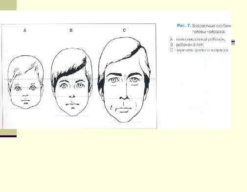 Голова анфас n Ширина лица определяется по скуловым костям. n Лицо делится примерно на три равные части по вертикали от нижней части подбородка до основания носа, от основания носа до переносья и от переносья до лобных бугров. n Между глаз помещается примерно ширина глаза.
