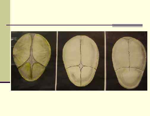 Череп новорожденного Анатомические особенности этого черепа имеют важное значение для акушерства и микропедиатрии. n Так как головной мозг и органы чувств развиваются быстрее всего, объем мозгового черепа в 6, 5 раз больше лицевого (375 см 3 > 57, 17 см 3). У взрослого человека отношение объема мозгового черепа к лицевому составляет 2 -2, 5: 1. n Швы черепа фактически отсутствуют, так края костей еще не имеют контакта между собой, а имеют роднички. Благодаря этому кости черепа обладают значительной подвижностью; это важно при родах, когда головка плода изменяет свою конфигурацию, чтобы приспособиться к форме родового канала. Поэтому, вытянутая во виде «груши» голова новорожденного не должна вызывать паники, ибо правильные очертания – вопрос времени. n Наличие родничков. Значение их в том, что кроме смещения костей черепа при родах, они в силу своей податливости выравнивают колебания внутричерепного давления, которые возникают при росте головного мозга; в акушерстве передний (лобный) и затылочный (задний) роднички являются ориентирами, который позволяют определить положение головки плода во время родов. n