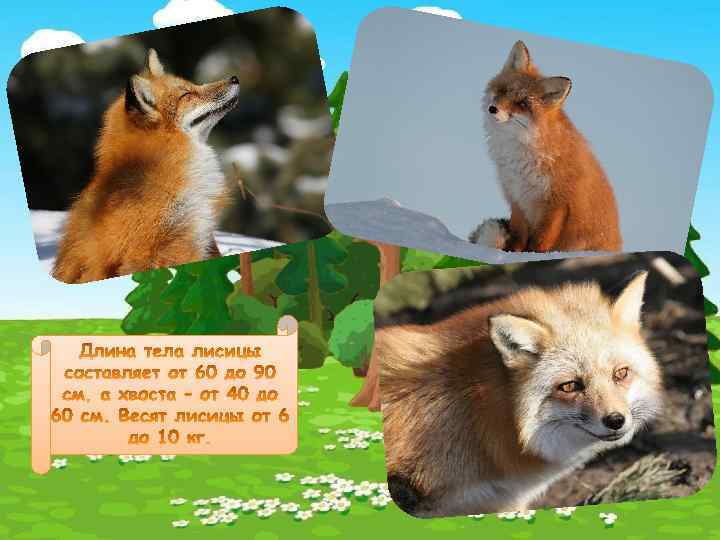 Лиса – очень известный персонаж русских народных сказок, а также множества других сказок и рассказов. Самой крупной является обыкновенная лисица, длина ее тела может доходить до 90 см, длина хвоста до 60 см, масса тела до 10 кг. На лапах у лисы есть чувствительные волоски, которые помогают ей ориентироватьс я в пространстве и находить нужное направление. Лисий хвост меняет свой внешний вид в зависимости от времени года, зимой он особенно красив. Самый мелкий представитель рода лисиц – фенек , по размерам он меньше домашней кошки.
