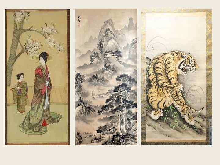 Современная японская культура испытала сильное влияние стран Азии (в особенности Китая и Кореи), Европы и Северной Америки. Одной из особенностей японской культуры является её долгое развитие в период полной изоляции страны (политика сакоку) от всего остального мира в период правления сёгуната Токугавы длившейся до середины XIX века — начала периода Мэйдзи. Для традиционной японской живописи характерно большое разнообразие стилей, формах и техниках. Живописные произведения могли иметь форму висячих свитков, свитков горизонтального формата, разворачивающихся по мере рассмотрения, могли быть в виде отдельных альбомных листов, они украшали веера, ширмы, стены. Основу же всех стилей при всем их многообразии составляют два главных направления: континентальное (привнесенное из Китая и Кореи) и чисто японское.