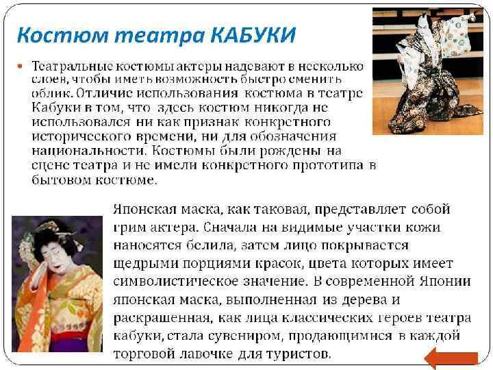 Японский театр Традиция японского сценического искусства насчитывает пять основных театральных жанров: бугаку, но, кёгэн, бунраку и кабуки. Все эти пять традиций существуют по настоящий день. Несмотря на значительные различия, они объединены общими эстетическими принципами, лежащими в основе японского традиционного искусства. Бугаку представляет собой церемониальный танец, часть придворного ритуала, Традиция театра кабуки, в отличие от элитарного но, связана с эгалитарной городской культурой. Кабуки был любимым зрелищем горожан всех слоев и уровней достатка и отвечал вкусам этой публики. Возникновение театра кабуки относится к самому началу XVII в. и связано с именем Окуни, известной исполнительницы ритуальных танцев при синтоистском храме в Идзумо. Она путешествовала по всей стране с небольшой группой танцовщиц; они не только исполняли танцы, но и разыгрывали целые представления, как правило в сухих руслах рек, где правительство не взимало пошлину со сборов.