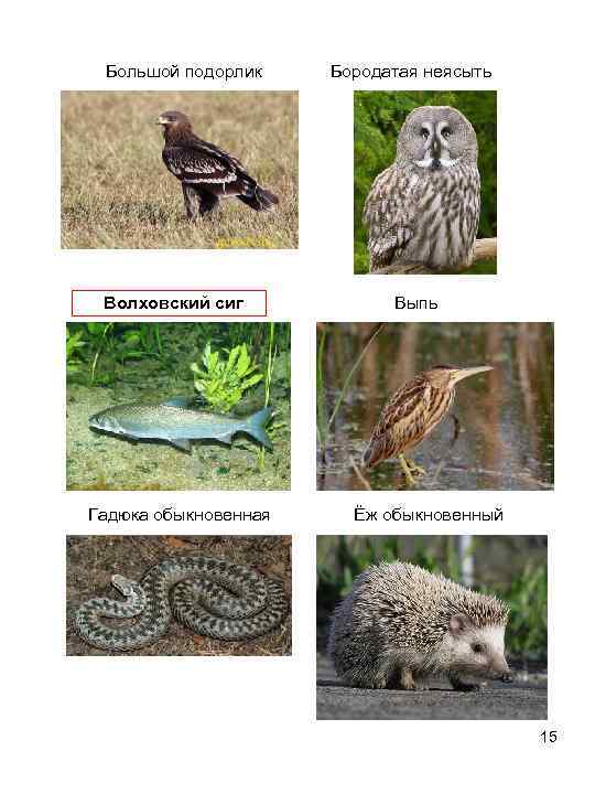 Большой подорлик Бородатая неясыть Волховский сиг Выпь Гадюка обыкновенная Ёж обыкновенный 15