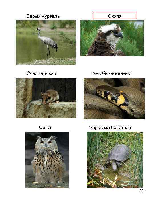 Серый журавль Скопа Соня садовая Уж обыкновенный Филин Черепаха болотная 19