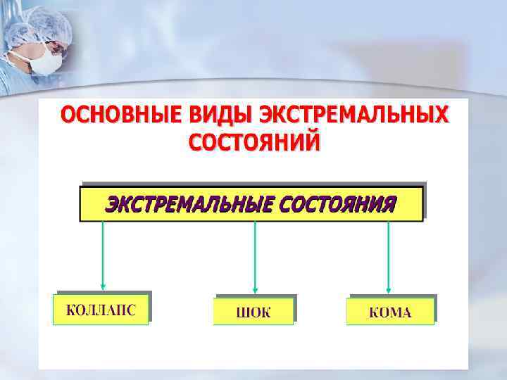 Вопросы к занятию: Ø Ø Ø Ø Шоковые состояния. Шок. Стадии (компенсаторная, декомпенсаторная). Централизация кровообращения при шоке. Классификация шоковых состояний. Частные примеры шоковых состояний. Травматический шок. Анафилактический шок. Кардиогенный шок. Принципы противошоковой терапии Коллапс. Общие патогенетические механизмы и конкретные этимологические факторы коллапса. Отличия шока от коллапса. Коматозные состояния. Кома. Первичная кома. Вторичная кома. Терминальные состояния. Преагональное состояние. Терминальная пауза. Период агонии. Клиническая смерть (КС).