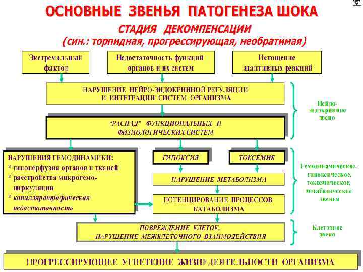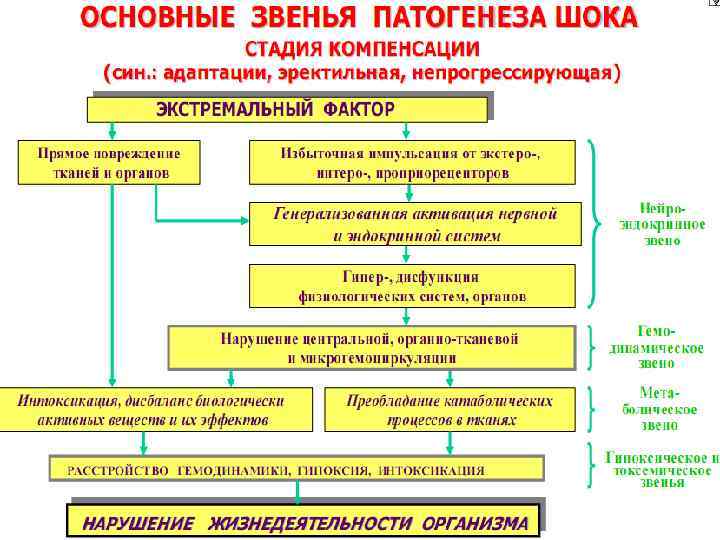 СТАДИИ ШОКА Для любого шока характерно двухфазное изменение деятельности ЦНС: n n первоначальное распространенное возбуждение нейронов ( «эректильная стадия» или стадия компенсации); в дальнейшем распространенное угнетение их активности ( «торпидная стадия» или стадия декомпенсации).