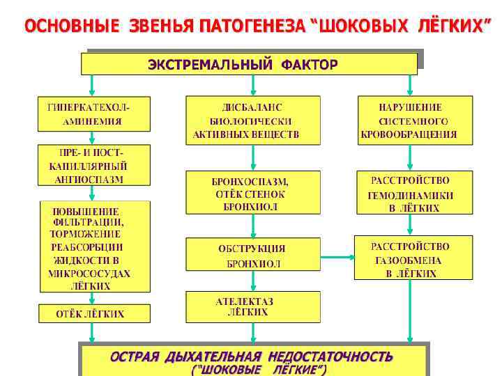 Ситуационные задачи 3. У мужчины 28 лет множественные переломы костей конечностей и ушибы туловища в результате автомобильной катастрофы. В стационар доставлен через 1 час после травмы в тяжелом состоянии: сознание спутанное; он бледен, покрыт "холодным" липким потом; зрачки узкие со слабой реакцией на свет; дыхание редкое, поверхностное; тоны сердца приглушены; пульс едва прощупывается; артериальное давление 60/40 мм. рт. ст. (120/70 мм. рт. ст. ); признаков наружной или внутренней кровопотери нет. Вопросы: 1. Какое состояние развилось у пациента в результате травмы? На какой стадии его развития находится пациент? 2. Каков патогенез «шоковых легких» у пациента? 3. Какие методы неотложной терапии необходимо провести?