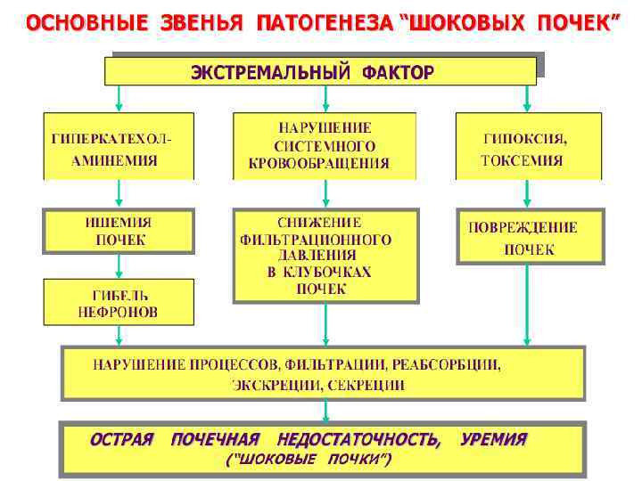 Ситуационные задачи 1. У больного К. , 20 лет, развился травматический шок в результате полученных травм в автомобильной катастрофе. Диурез 90 мл/сут (1600 -2000 мл/сут), креатинин крови - 0, 55 ммоль/л (0, 07 -0, 10 ммоль/л), мочевина - 26 ммоль/л (3, 3 -6, 6 ммоль/л), К крови - 6, 8 ммоль/л (3, 4 -5, 3 ммоль/л). Вопросы: 1. Нарушение функции, какого органа имеет место у данного больного? 2. Укажите ключевые механизмы развития травматического шока. 3. Укажите основные звенья патогенеза нарушений функции почек при шоке ( «шоковая почка» ).