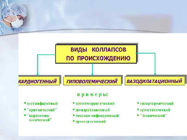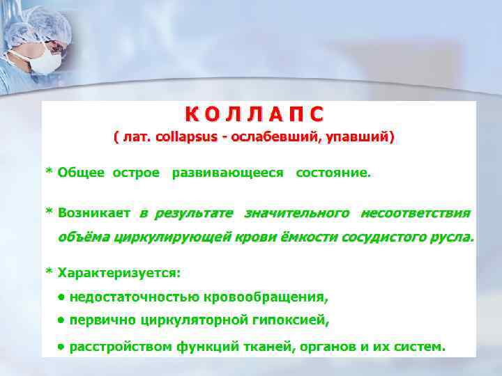 Некоторые отличия шока от коллапса Параметры Шок Коллапс Этиология Шок- «коллапс от травмы» в результате раздражения экстерорецепторов. Коллапс – это «шок без травмы» , вызывается интоксикацией в рез. раздражения интерорецепторов. Преобладание основного звена в патогенезе Изменения в ЦНС- первичны Первичны острая слабость сосудов и сердца. Особенности течения Фазное, развивается относительно быстро. Отсутствие фаз, развивается относительно медленно. Зависимость тяжести от ↓ АД Прямой зависимости нет Прямая зависимость Наркоз и обезболивание В начальной стадии имеют профил. и лечебное значение Оказывает отрицательное влияние