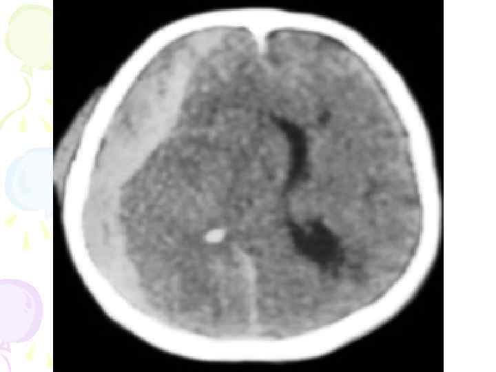 Клиника: после нескольких часов, суток светлого промежутка наблюдается двигательное беспокойство, крик, состояние прогрессивно ухудшается. Симптомы: -широкий зрачок на стороне кровоизлияния -фокальные или диф. тоникоклонические судороги -на противоположной стороне кровоизлиянию гемипарез -нарастает брадикардия, снижение давления -застойные явления на глазном дне