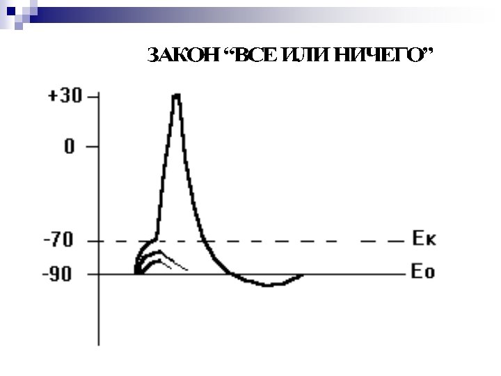 Порог раздражения n Минимальное значение силы раздражителя, необходимое для снижения заряда мембраны от уровня покоя (Ео) до критического уровня (Ео), называется пороговым раздражителем. n Подпороговый раздражитель меньше по силе, чем пороговый Сверхпороговый (надпороговый) раздражитель - сильнее порогового n