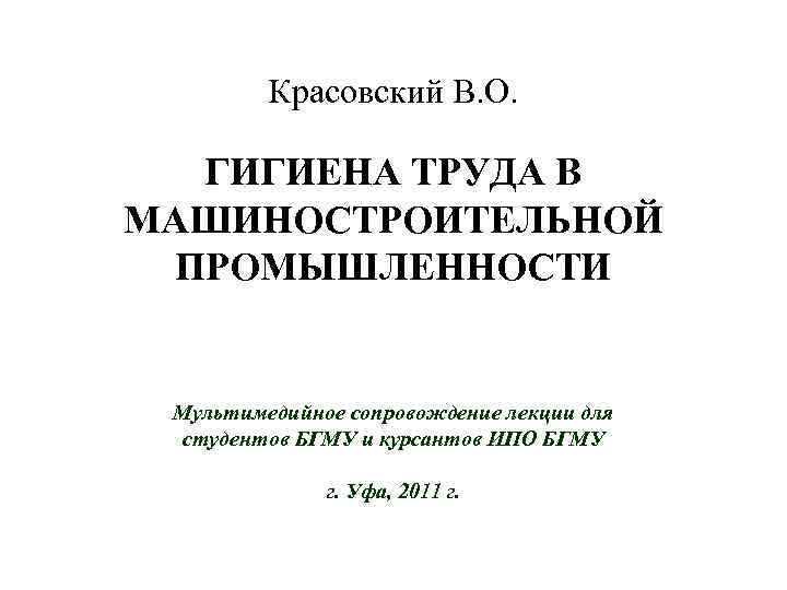 Красовский В. О. ГИГИЕНА ТРУДА В МАШИНОСТРОИТЕЛЬНОЙ ПРОМЫШЛЕННОСТИ Мультимедийное сопровождение лекции для студентов БГМУ и курсантов ИПО БГМУ г. Уфа, 2011 г.