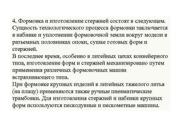 4. Формовка и изготовление стержней состоят в следующем. Сущность технологического процесса формовки заключается в набивке и уплотнении формовочной земли вокруг модели в разъемных половинках опоки, сушке готовых форм и стержней. В последнее время, особенно в литейных цехах конвейерного типа, изготовление форм и стержней механизировано путем применения различных формовочных машин встряхивающего типа. При формовке крупных изделий в литейных тяжелого литья (на плацу) применяются также ручные пневматические трамбовки. Для изготовления стержней и набивки крупных форм используются пескодувные и пескометные машины.