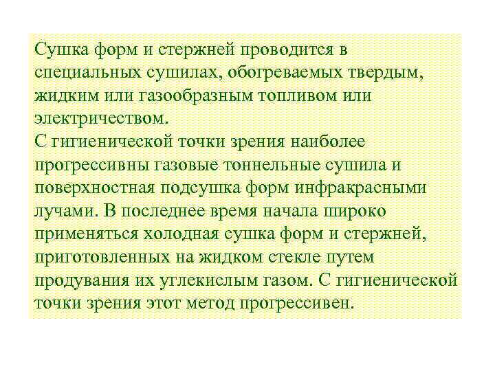 Сушка форм и стержней проводится в специальных сушилах, обогреваемых твердым, жидким или газообразным топливом или электричеством. С гигиенической точки зрения наиболее прогрессивны газовые тоннельные сушила и поверхностная подсушка форм инфракрасными лучами. В последнее время начала широко применяться холодная сушка форм и стержней, приготовленных на жидком стекле путем продувания их углекислым газом. С гигиенической точки зрения этот метод прогрессивен.