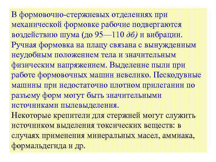 В формовочно стержневых отделениях при механической формовке рабочие подвергаются воздействию шума (до 95— 110 дб) и вибрации. Ручная формовка на плацу связана с вынужденным неудобным положением тела и значительным физическим напряжением. Выделение пыли при работе формовочных машин невелико. Пескодувные машины при недостаточно плотном прилегании по разъему форм могут быть значительными источниками пылевыделения. Некоторые крепители для стержней могут служить источником выделения токсических веществ: в случаях применения минеральных масел, аммиака, формальдегида и др.