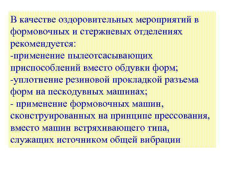 В качестве оздоровительных мероприятий в формовочных и стержневых отделениях рекомендуется: применение пылеотсасывающих приспособлений вместо обдувки форм; уплотнение резиновой прокладкой разъема форм на пескодувных машинах; применение формовочных машин, сконструированных на принципе прессования, вместо машин встряхивающего типа, служащих источником общей вибрации
