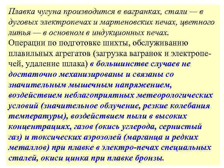 Плавка чугуна производится в вагранках, стали — в дуговых электропечах и мартеновских печах, цветного литья — в основном в индукционных печах. Операции по подготовке шихты, обслуживанию плавильных агрегатов (загрузка вагранок и электропе чей, удаление шлака) в большинстве случаев не достаточно механизированы и связаны со значительным мышечным напряжением, воздействием неблагоприятных метеорологических условий (значительное облучение, резкие колебания температуры), воздействием пыли в высоких концентрациях, газов (окись углерода, сернистый газ) и токсических аэрозолей (марганца и редких металлов) при плавке в электро-печах специальных сталей, окиси цинка при плавке бронзы.