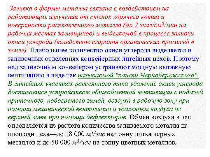Заливка в формы металла связана с воздействием на работающих излучения от стенок горячего ковша и поверхности расплавленного металла (до 2 гкал/см 2/мин на рабочих местах заливщиков) и выделяемой в процессе заливки окиси углерода (вследствие сгорания органических примесей в земле). Наибольшее количество окиси углерода выделяется в заливочных отделениях конвейерных литейных цехов. Поэтому над заливочным конвейером устраивают мощную вытяжную вентиляцию в виде так называемой "панели Чернобережского". В литейных участках рассеянного типа удаление окиси углерода достигается устройством общеобменной вентиляции с подачей приточного, подогретого зимой, воздуха в рабочую зону при помощи механической вентиляции и удалением воздуха из верхней зоны при помощи дефлекторов. Обмен воздуха в час определяется из расчета количества заливаемого металла на площади цеха—до 18 000 м 3/час на тонну литья черных металлов и до 50 000 м 3/час на тонну цветных металлов.
