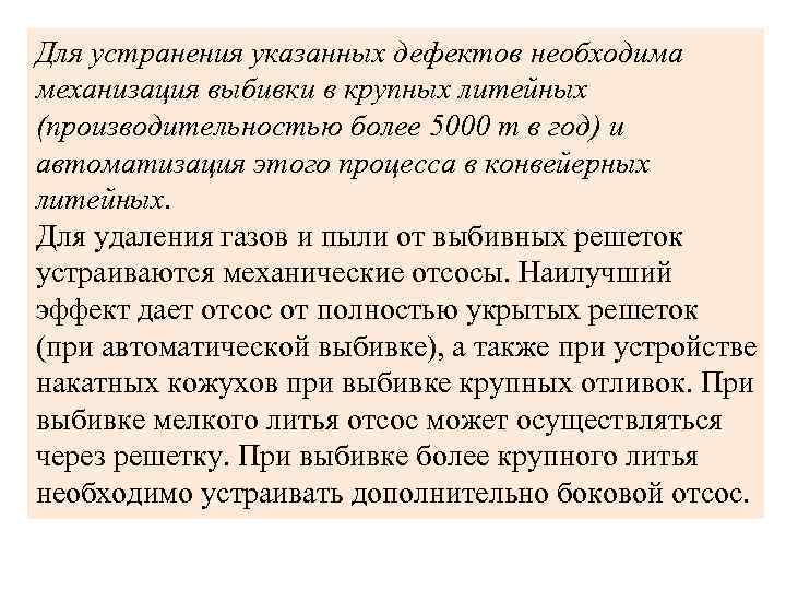 Для устранения указанных дефектов необходима механизация выбивки в крупных литейных (производительностью более 5000 т в год) и автоматизация этого процесса в конвейерных литейных. Для удаления газов и пыли от выбивных решеток устраиваются механические отсосы. Наилучший эффект дает отсос от полностью укрытых решеток (при автоматической выбивке), а также при устройстве накатных кожухов при выбивке крупных отливок. При выбивке мелкого литья отсос может осуществляться через решетку. При выбивке более крупного литья необходимо устраивать дополнительно боковой отсос.