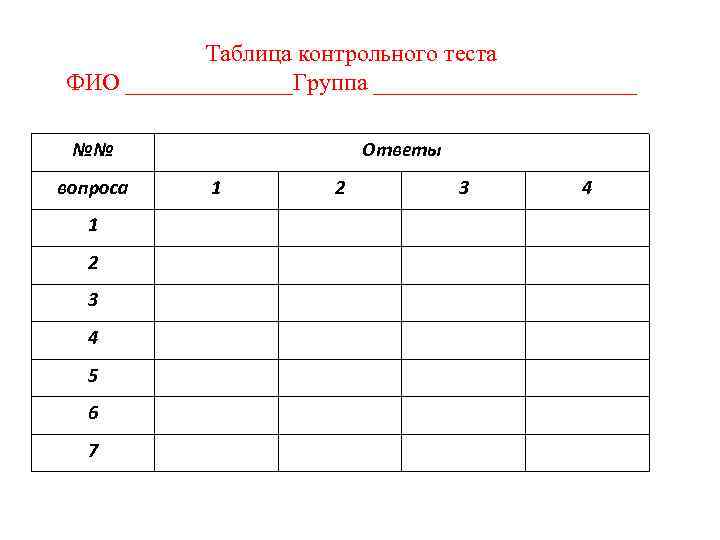 Таблица контрольного теста ФИО _______Группа ___________ №№ вопроса 1 2 3 4 5 6 7 Ответы 1 2 3 4