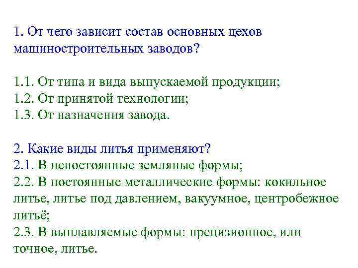 1. От чего зависит состав основных цехов машиностроительных заводов? 1. 1. От типа и вида выпускаемой продукции; 1. 2. От принятой технологии; 1. 3. От назначения завода. 2. Какие виды литья применяют? 2. 1. В непостоянные земляные формы; 2. 2. В постоянные металлические формы: кокильное литье, литье под давлением, вакуумное, центробежное литьё; 2. 3. В выплавляемые формы: прецизионное, или точное, литье.