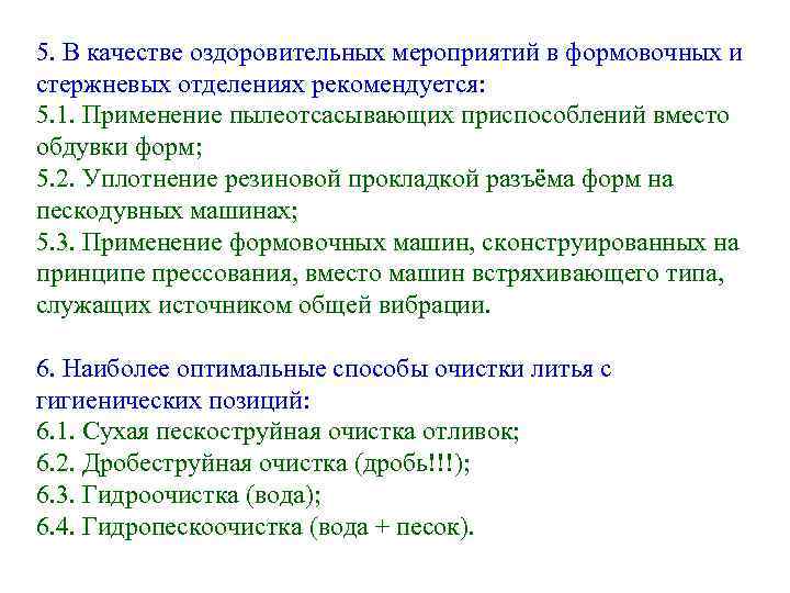 5. В качестве оздоровительных мероприятий в формовочных и стержневых отделениях рекомендуется: 5. 1. Применение пылеотсасывающих приспособлений вместо обдувки форм; 5. 2. Уплотнение резиновой прокладкой разъёма форм на пескодувных машинах; 5. 3. Применение формовочных машин, сконструированных на принципе прессования, вместо машин встряхивающего типа, служащих источником общей вибрации. 6. Наиболее оптимальные способы очистки литья с гигиенических позиций: 6. 1. Сухая пескоструйная очистка отливок; 6. 2. Дробеструйная очистка (дробь!!!); 6. 3. Гидроочистка (вода); 6. 4. Гидропескоочистка (вода + песок).