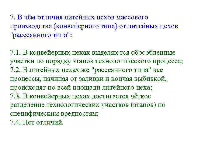 7. В чём отличия литейных цехов массового производства (конвейерного типа) от литейных цехов "рассеянного типа": 7. 1. В конвейерных цехах выделяются обособленные участки по порядку этапов технологического процесса; 7. 2. В литейных цехах же "рассеянного типа" все процессы, начиная от заливки и кончая выбивкой, происходят по всей площади литейного цеха; 7. 3. В конвейерных цехах достигается чёткое разделение технологических участков (этапов) по специфическим вредностям; 7. 4. Нет отличий.