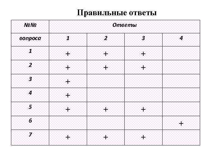 Правильные ответы №№ Ответы вопроса 1 2 3 1 + + + 2 3 4 5 + 6 7 4 + + +