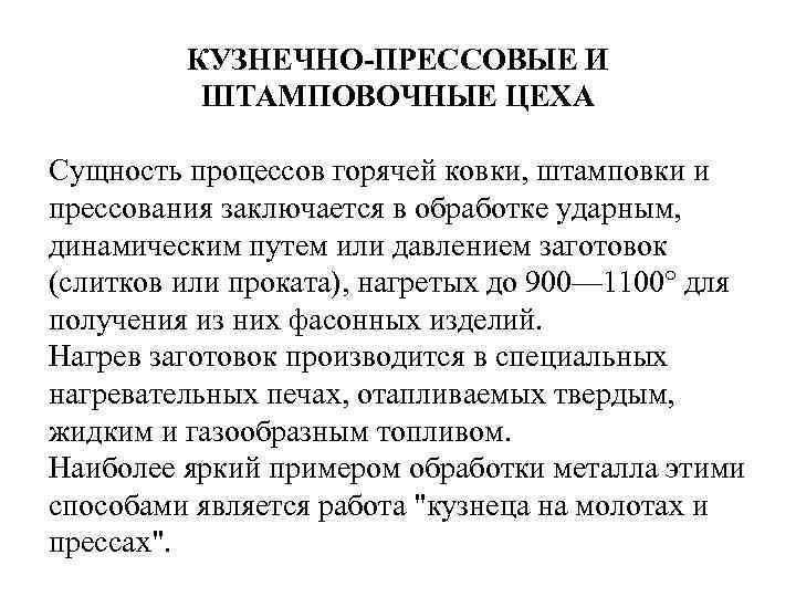 КУЗНЕЧНО-ПРЕССОВЫЕ И ШТАМПОВОЧНЫЕ ЦЕХА Сущность процессов горячей ковки, штамповки и прессования заключается в обработке ударным, динамическим путем или давлением заготовок (слитков или проката), нагретых до 900— 1100° для получения из них фасонных изделий. Нагрев заготовок производится в специальных нагревательных печах, отапливаемых твердым, жидким и газообразным топливом. Наиболее яркий примером обработки металла этими способами является работа "кузнеца на молотах и прессах".