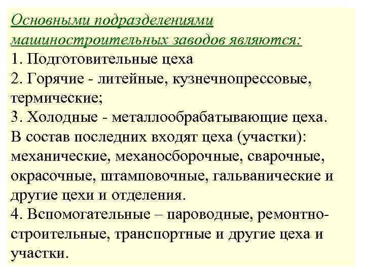 Основными подразделениями машиностроительных заводов являются: 1. Подготовительные цеха 2. Горячие литейные, кузнечнопрессовые, термические; 3. Холодные металлообрабатывающие цеха. В состав последних входят цеха (участки): механические, механосборочные, сварочные, окрасочные, штамповочные, гальванические и другие цехи и отделения. 4. Вспомогательные – пароводные, ремонтно строительные, транспортные и другие цеха и участки.