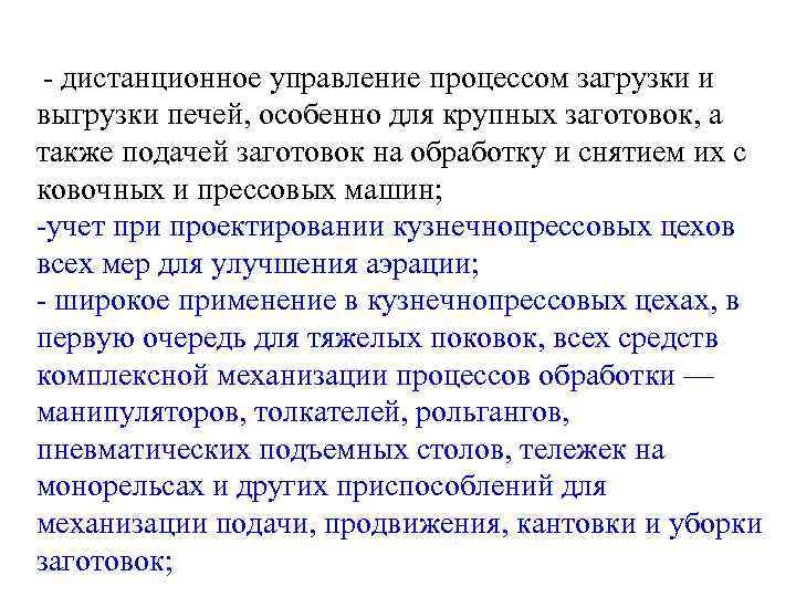 дистанционное управление процессом загрузки и выгрузки печей, особенно для крупных заготовок, а также подачей заготовок на обработку и снятием их с ковочных и прессовых машин; учет при проектировании кузнечнопрессовых цехов всех мер для улучшения аэрации; широкое применение в кузнечнопрессовых цехах, в первую очередь для тяжелых поковок, всех средств комплексной механизации процессов обработки — манипуляторов, толкателей, рольгангов, пневматических подъемных столов, тележек на монорельсах и других приспособлений для механизации подачи, продвижения, кантовки и уборки заготовок;