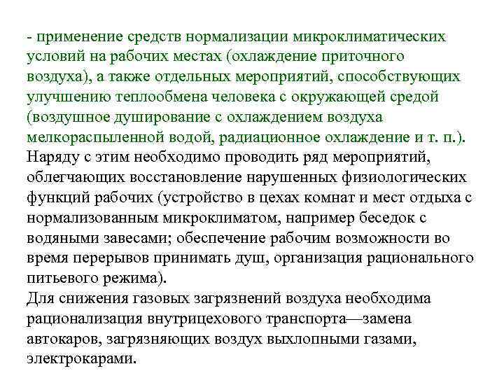 применение средств нормализации микроклиматических условий на рабочих местах (охлаждение приточного воздуха), а также отдельных мероприятий, способствующих улучшению теплообмена человека с окружающей средой (воздушное душирование с охлаждением воздуха мелкораспыленной водой, радиационное охлаждение и т. п. ). Наряду с этим необходимо проводить ряд мероприятий, облегчающих восстановление нарушенных физиологических функций рабочих (устройство в цехах комнат и мест отдыха с нормализованным микроклиматом, например беседок с водяными завесами; обеспечение рабочим возможности во время перерывов принимать душ, организация рационального питьевого режима). Для снижения газовых загрязнений воздуха необходима рационализация внутрицехового транспорта—замена автокаров, загрязняющих воздух выхлопными газами, электрокарами.