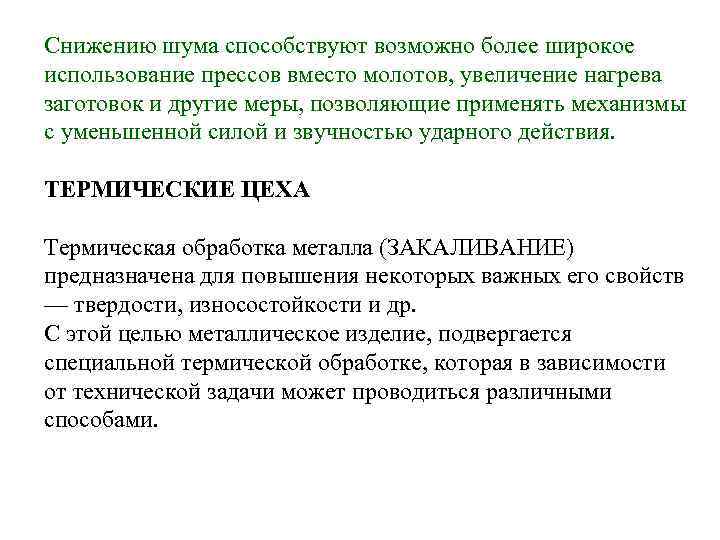 Снижению шума способствуют возможно более широкое использование прессов вместо молотов, увеличение нагрева заготовок и другие меры, позволяющие применять механизмы с уменьшенной силой и звучностью ударного действия. ТЕРМИЧЕСКИЕ ЦЕХА Термическая обработка металла (ЗАКАЛИВАНИЕ) предназначена для повышения некоторых важных его свойств — твердости, износостойкости и др. С этой целью металлическое изделие, подвергается специальной термической обработке, которая в зависимости от технической задачи может проводиться различными способами.