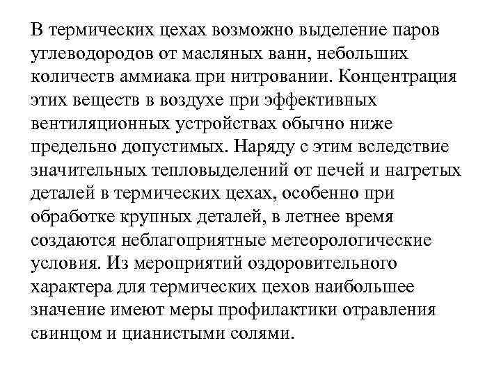 В термических цехах возможно выделение паров углеводородов от масляных ванн, небольших количеств аммиака при нитровании. Концентрация этих веществ в воздухе при эффективных вентиляционных устройствах обычно ниже предельно допустимых. Наряду с этим вследствие значительных тепловыделений от печей и нагретых деталей в термических цехах, особенно при обработке крупных деталей, в летнее время создаются неблагоприятные метеорологические условия. Из мероприятий оздоровительного характера для термических цехов наибольшее значение имеют меры профилактики отравления свинцом и цианистыми солями.