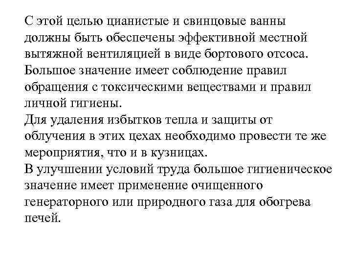 С этой целью цианистые и свинцовые ванны должны быть обеспечены эффективной местной вытяжной вентиляцией в виде бортового отсоса. Большое значение имеет соблюдение правил обращения с токсическими веществами и правил личной гигиены. Для удаления избытков тепла и защиты от облучения в этих цехах необходимо провести те же мероприятия, что и в кузницах. В улучшении условий труда большое гигиеническое значение имеет применение очищенного генераторного или природного газа для обогрева печей.