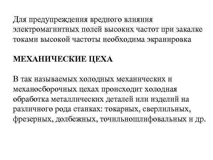 Для предупреждения вредного влияния электромагнитных полей высоких частот при закалке токами высокой частоты необходима экранировка МЕХАНИЧЕСКИЕ ЦЕХА В так называемых холодных механических и механосборочных цехах происходит холодная обработка металлических деталей или изделий на различного рода станках: токарных, сверлильных, фрезерных, долбежных, точильношлифовальных и др.