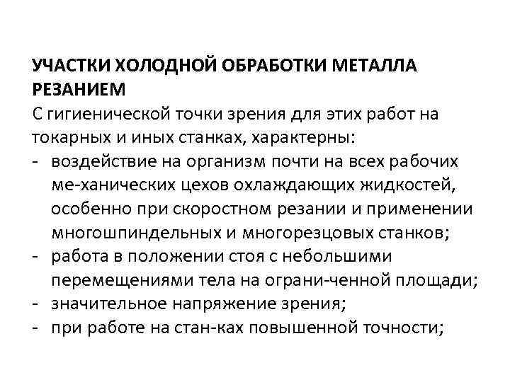 УЧАСТКИ ХОЛОДНОЙ ОБРАБОТКИ МЕТАЛЛА РЕЗАНИЕМ С гигиенической точки зрения для этих работ на токарных и иных станках, характерны: воздействие на организм почти на всех рабочих ме ханических цехов охлаждающих жидкостей, особенно при скоростном резании и применении многошпиндельных и многорезцовых станков; работа в положении стоя с небольшими перемещениями тела на ограни ченной площади; значительное напряжение зрения; при работе на стан ках повышенной точности;